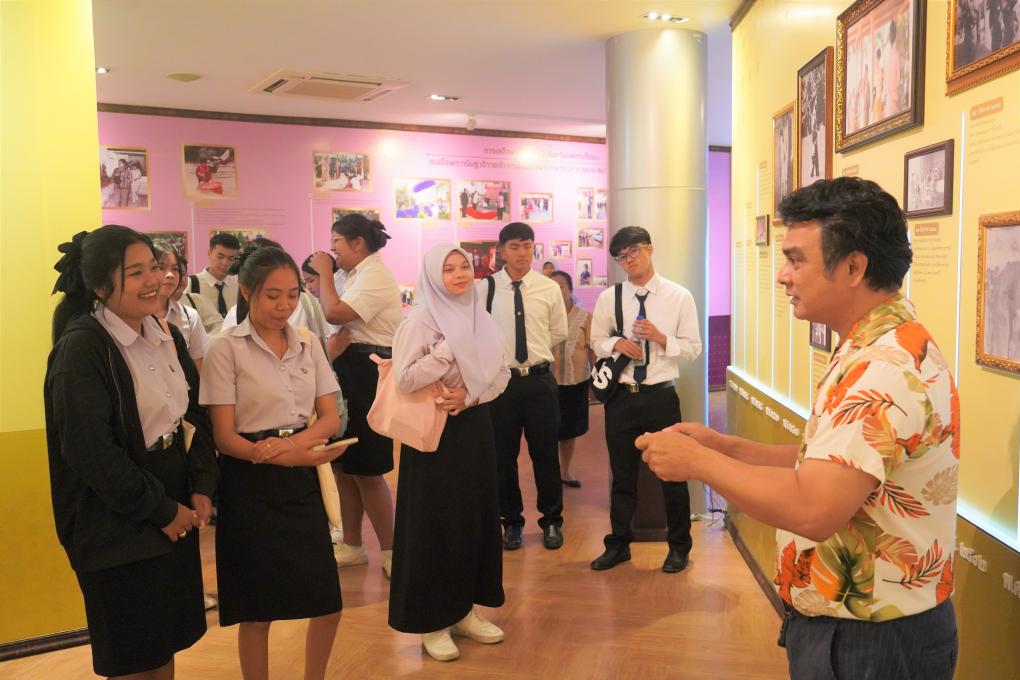 วันที่ 14 กรกฏาคม 2568 นักศึกษาสาขาวิชาวิทยาศาสตร์และเทคโนโลยี ชั้นปีที่ 1 คณะวิทยาศาสตร์และเทคโนโลยี จำนวน 25 คน และนักศึกษาสาขาวิชาภาษาไทย ชั้นปีที่ 1 คณะมนุษยศาสตร์และสังคมศาสตร์ มหาวิทยาลัยราชภัฏเพชรบุรี จำนวน 54 คน เข้าเยี่ยมชมศูนย์เรียนรู้ศาสตร์พระราชาและภูมิปัญญาราชภัฏเพชรบุรี สำนักวิทยบริการและเทคโนโลยีสารสนเทศ มหาวิทยาลัยราชภัฏเพชรบุรี เป็นการบูรณาการการเรียนการสอนกับราชวิชาจริยธรรมความเป็นครู โดย อาจารย์ ดร.เอื้อมพร โตภานุรักษ์กุล เป็นผู้สอน เพื่อให้นักศึกษาได้รู้จักแหล่งเรียนรู้ของมหาวิทยาลัย ในการเข้าเยี่ยมชมครั้งนี้ บุคลากรสำนักวิทยบริการและเทคโนโลยีสารสนเทศ ได้นำชมศูนย์เรียนรู้ศาสตร์พระราชาและภูมิปัญญาราชภัฏเพชรบุรี เริ่มตั้งแต่หอเกียรติภูมิปัญญามหาวิทยาลัยราชภัฏเพชรบุรี (PBRU Hall of Fame) และศูนย์เรียนรู้ศาสตร์พระราชาเพื่อการพัฒนาอย่างยั่งยืน ประกอบด้วยนิทรรศการ 3 ห้อง คือ ห้องรอยเสด็จฯ เพชรบุรี ห้องเฉลิมพระเกียรติ รัชกาลที่ 10 และพระบรมวงศ์ และห้องราชภัฏน้อมนำแนวพระราชดำริเพื่อการพัฒนา
